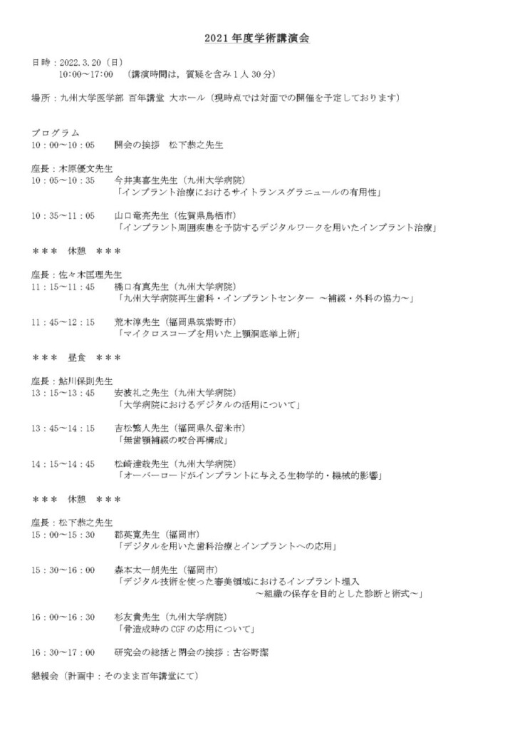 2022/03/20 講演会情報 九州大学再生歯科・インプラント研究会 学術講演会 依頼講演 講演タイトル 「デジタル技術を使った審美領域におけるインプラント埋入〜組織の保存を目的とした診断と術式〜」 2022年3月20日(日)森本太一朗